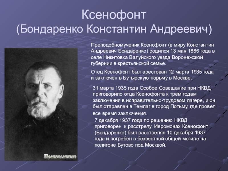 Отец Ксенофонт был арестован 12 марта 1935 года и заключен в Бутырскую тюрьму в Москве.