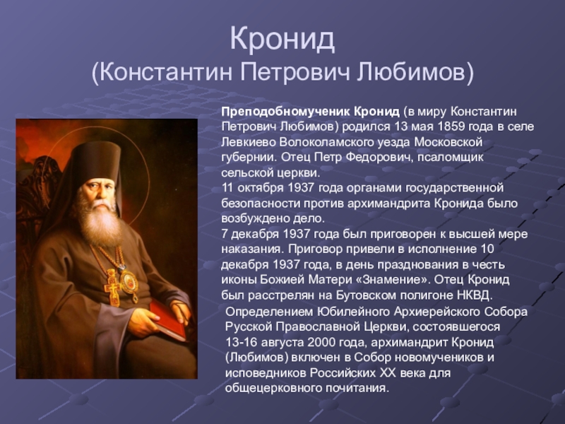 Определением Юбилейного Архиерейского Собора Русской Православной Церкви, состоявшегося 13-16 августа 2000 года, архимандрит Кронид (Любимов) включен в Собор новомучеников и исповедников Российских XX века для общецерковного почитания.