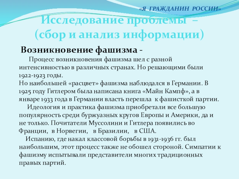 Но наибольшей «расцвет» фашизма наблюдался в Германии. В 1925 году Гитлером была написана книга «Майн Кампф», а в январе 1933 года в Германии власть перешла к фашисткой партии.