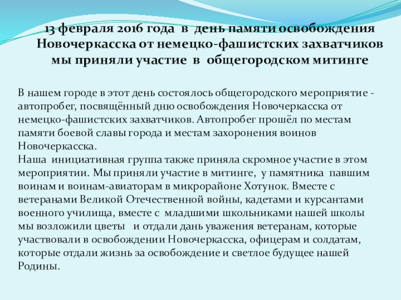 Слайд 6413 февраля 2016 года в день памяти освобождения Новочеркасска от немецко-фашистских