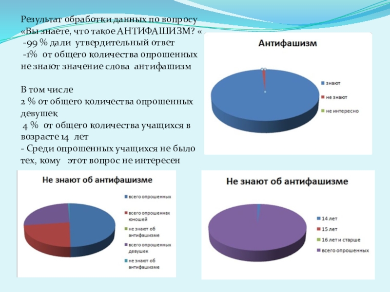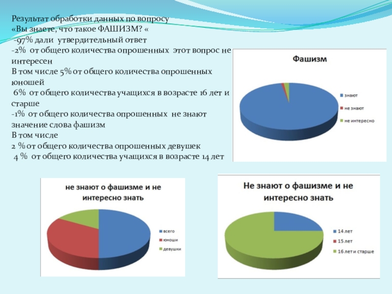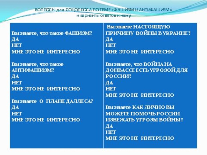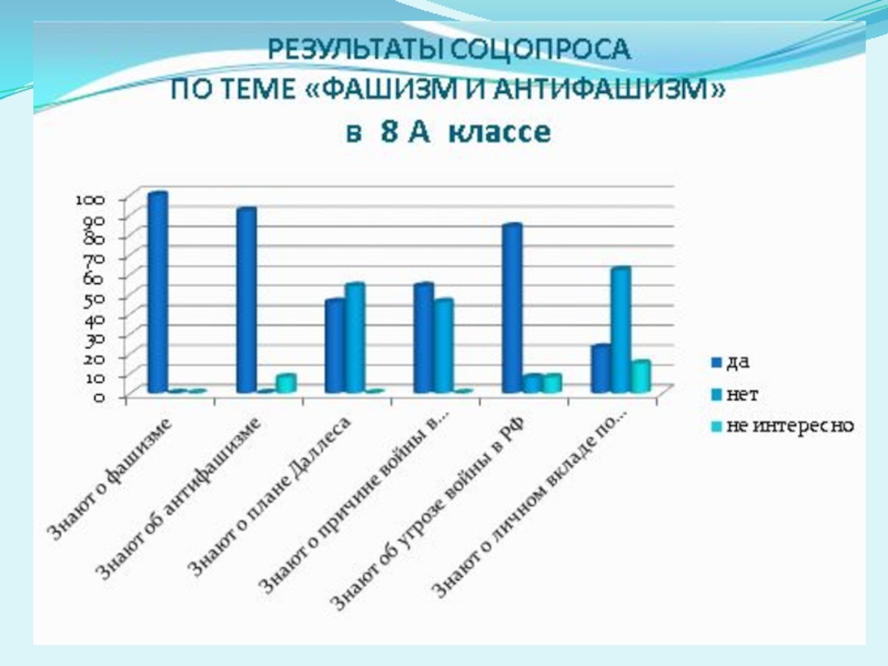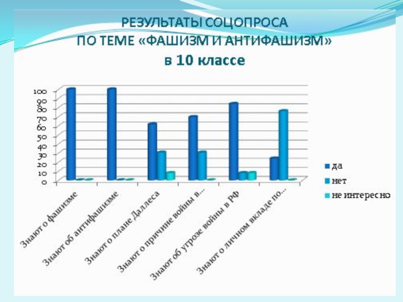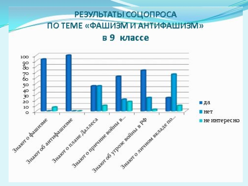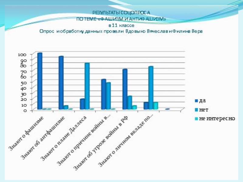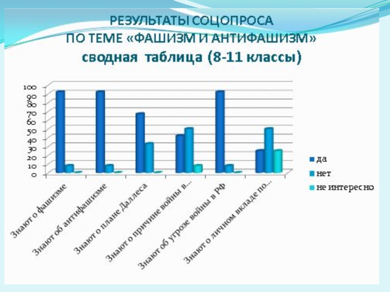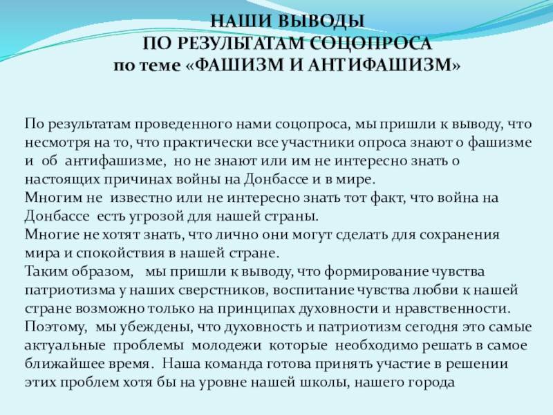 проведенного нами соцопроса, мы пришли к выводу, что несмотря на то, что практически все участники опроса знают о фашизме и об антифашизме, но не знают или им не интересно знать о настоящих причинах войны на Донбассе и в мире.
