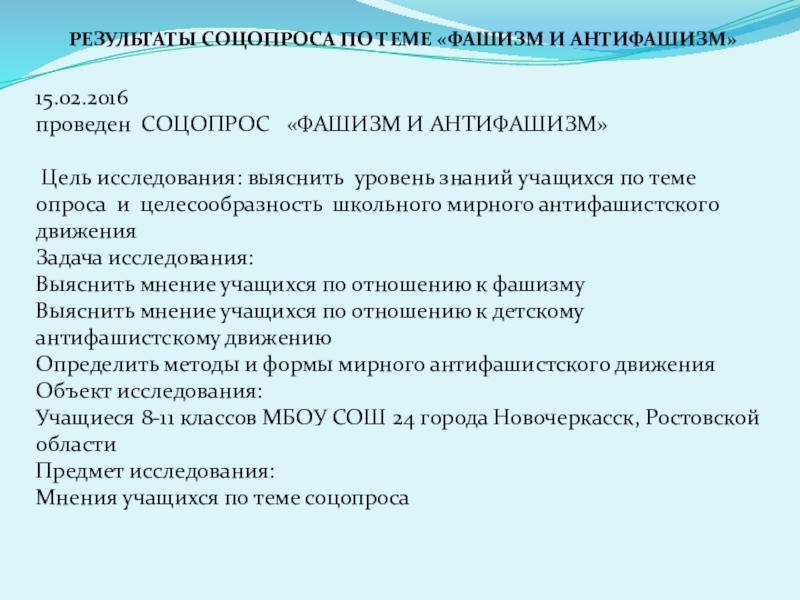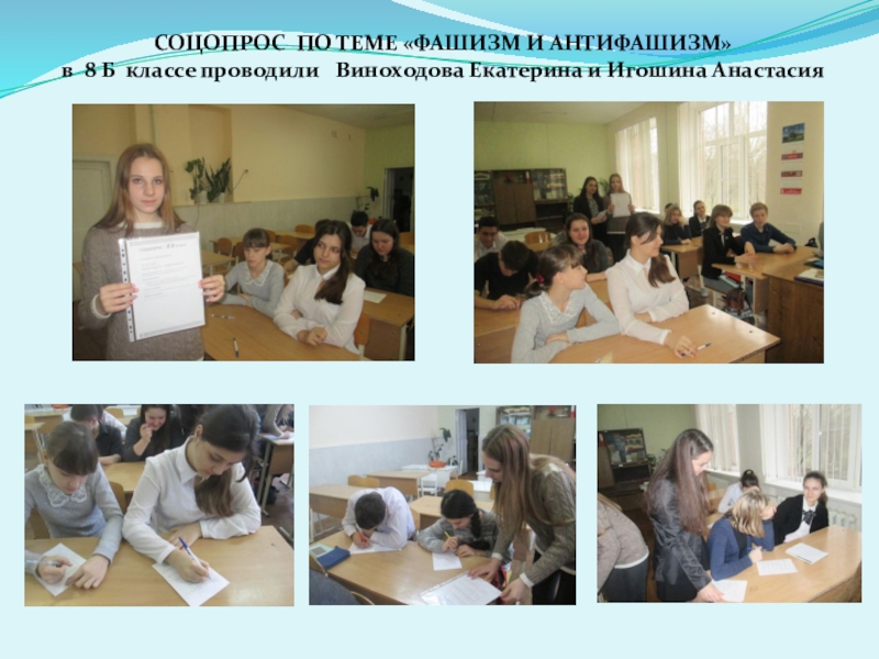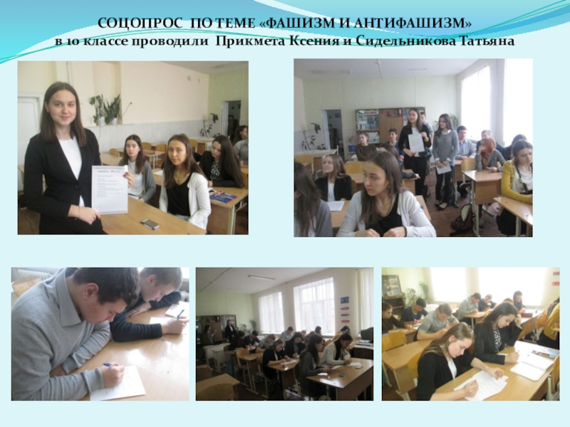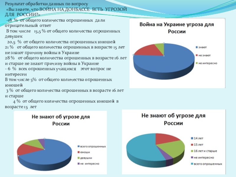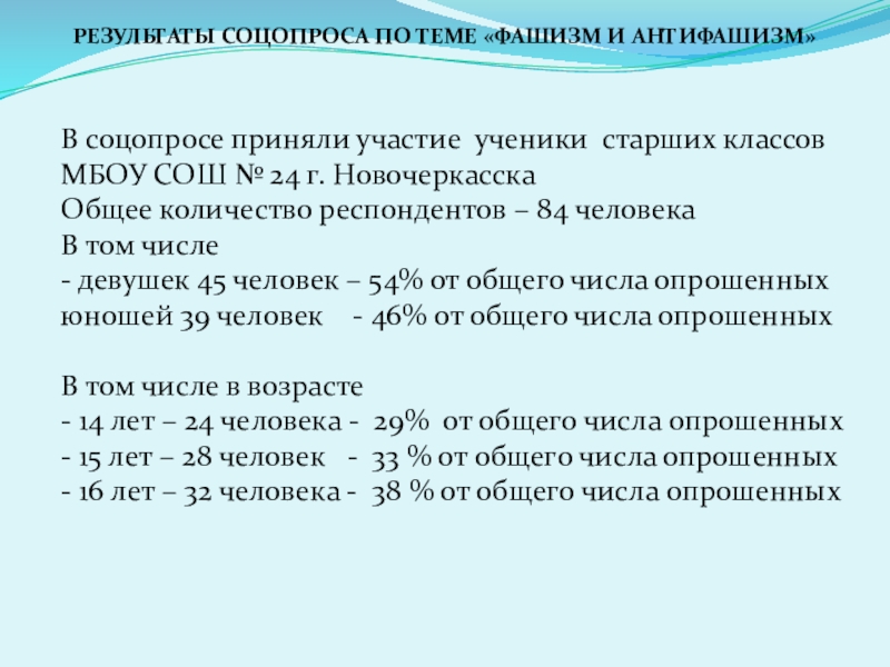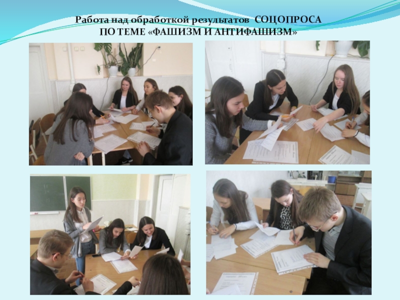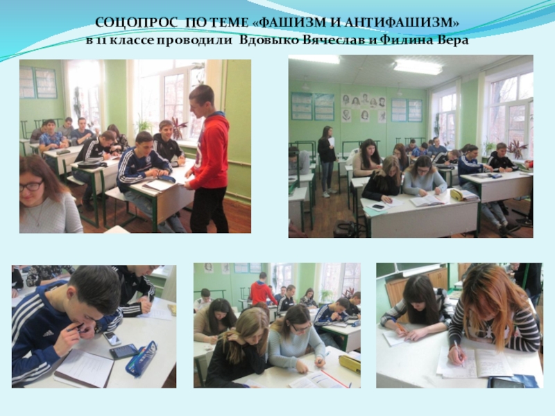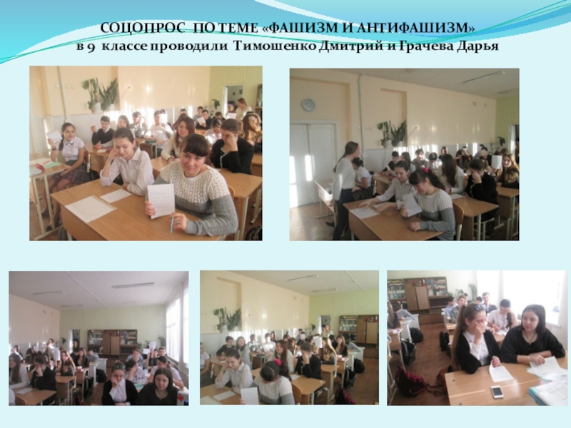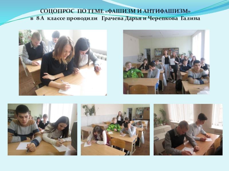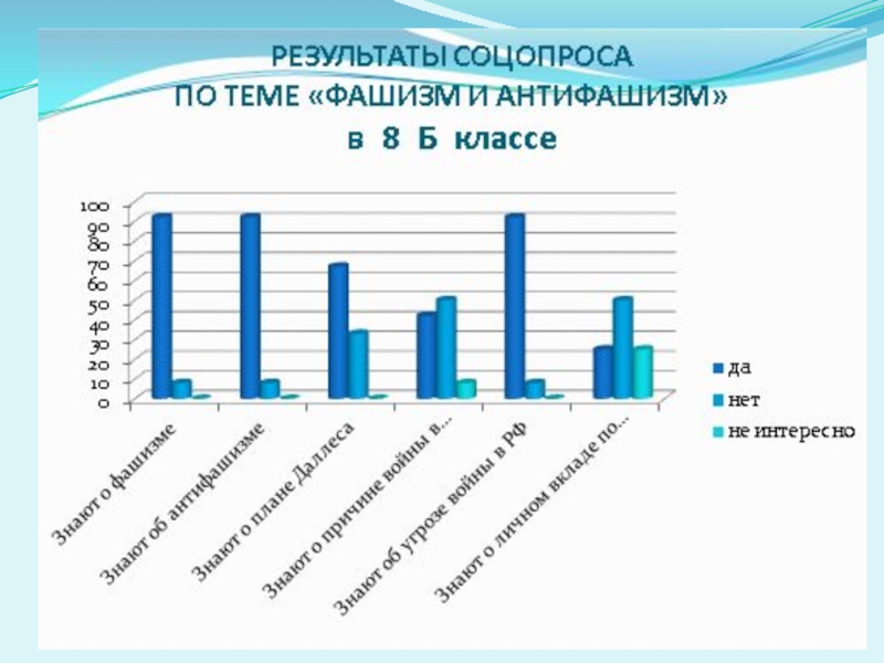 проведенного нами соцопроса, мы пришли к выводу, что несмотря на то, что практически все участники опроса знают о фашизме и об антифашизме, но не знают или им не интересно знать о настоящих причинах войны на Донбассе и в мире.