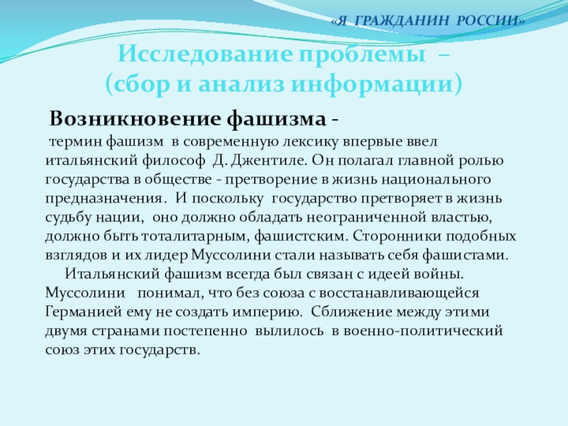 термин фашизм в современную лексику впервые ввел итальянский философ Д. Джентиле. Он полагал главной ролью государства в обществе - претворение в жизнь национального предназначения. И поскольку государство претворяет в жизнь судьбу нации, оно должно обладать неограниченной властью, должно быть тоталитарным, фашистским. Сторонники подобных взглядов и их лидер Муссолини стали называть себя фашистами.