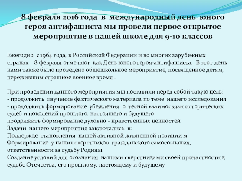 8 февраля 2016 года в международный день юного героя антифашиста мы провели первое открытое мероприятие в нашей школе для 9-10 классов