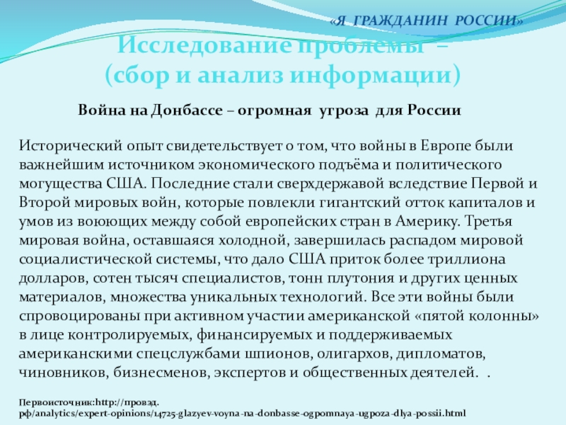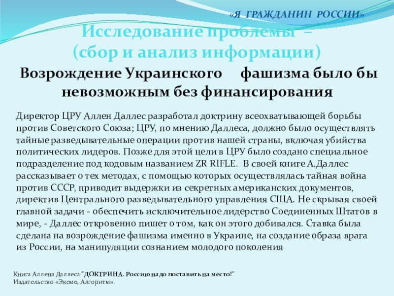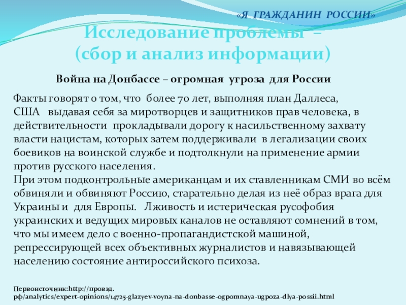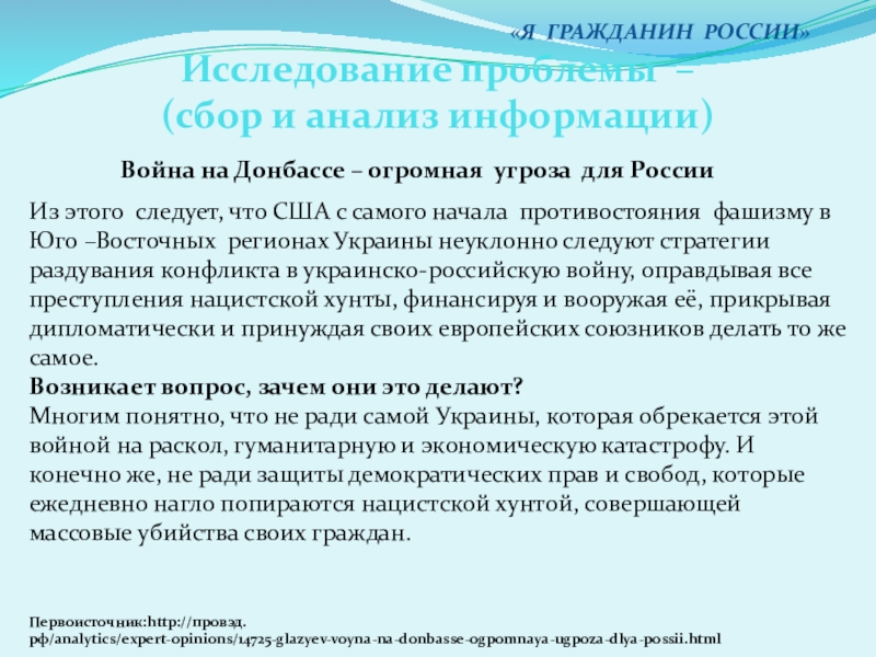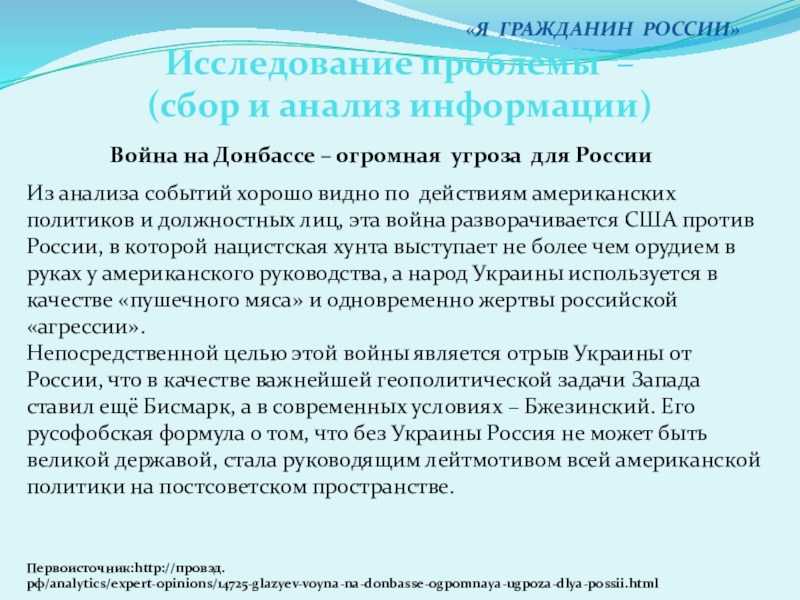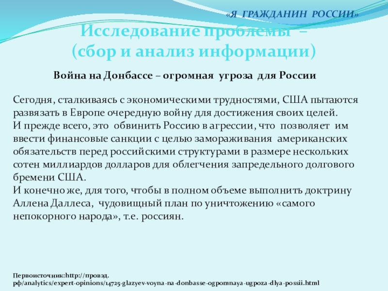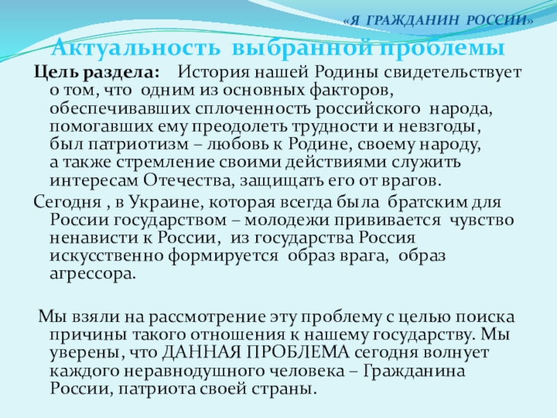 Мы взяли на рассмотрение эту проблему с целью поиска причины такого отношения к нашему государству. Мы уверены, что ДАННАЯ ПРОБЛЕМА сегодня волнует каждого неравнодушного человека – Гражданина России, патриота своей страны.