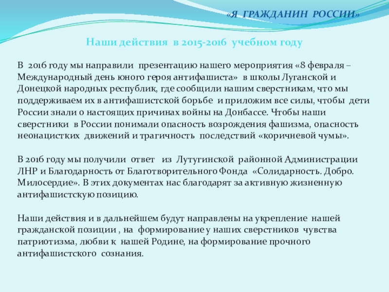2016 году мы направили презентацию нашего мероприятия «8 февраля – Международный день юного героя антифашиста» в школы Луганской и Донецкой народных республик, где сообщили нашим сверстникам, что мы поддерживаем их в антифашистской борьбе и приложим все силы, чтобы дети России знали о настоящих причинах войны на Донбассе. Чтобы наши сверстники в России понимали опасность возрождения фашизма, опасность неонацистких движений и трагичность последствий «коричневой чумы».