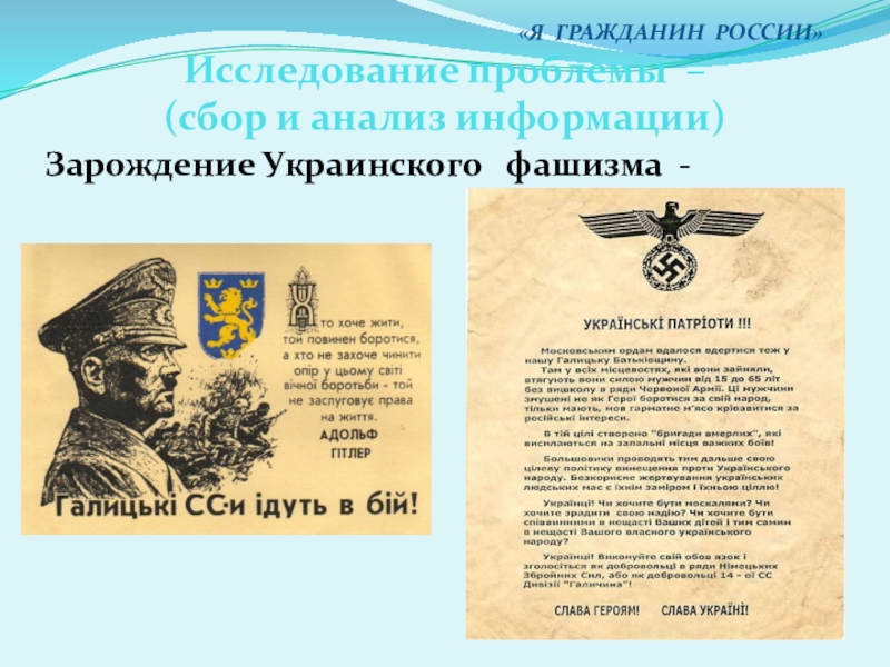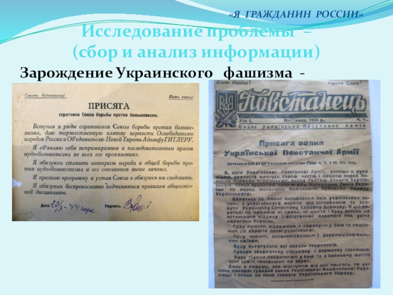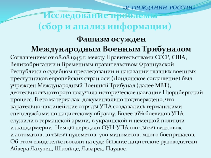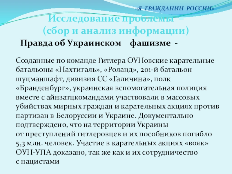 Созданные по команде Гитлера ОУНовские карательные батальоны «Нахтигаль», «Роланд», 201-й батальон шуцманшафт, дивизия СС «Галичина», полк «Бранденбург», украинская вспомогательная полиция вместе с айнзатцкомандами участвовали в массовых убийствах мирных граждан и карательных акциях против партизан в Белоруссии и Украине. Документально подтверждено, что на территории Украины от преступлений гитлеровцев и их пособников погибло 5,3 млн. человек. Участие в карательных акциях «вояк» ОУН-УПА доказано, так же как и их сотрудничество с нацистами