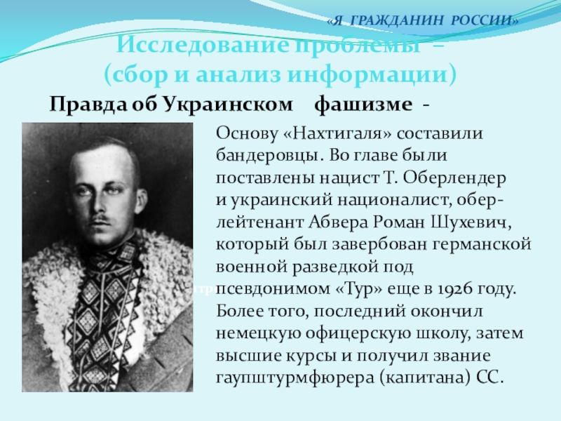 Т. Оберлендер и украинский националист, обер-лейтенант Абвера Роман Шухевич, который был завербован германской военной разведкой под псевдонимом «Тур» еще в 1926 году. Более того, последний окончил немецкую офицерскую школу, затем высшие курсы и получил звание гаупштурмфюрера (капитана) СС