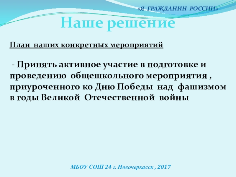 Наша инициативная группа также приняла скромное участие в этом мероприятии. Мы приняли участие в митинге, у памятника павшим воинам и воинам-авиаторам в микрорайоне Хотунок. Вместе с ветеранами Великой Отечественной войны, кадетами и курсантами военного училища, вместе с младшими школьниками нашей школы мы возложили цветы и отдали дань уважения ветеранам, которые участвовали в освобождении Новочеркасска, офицерам и солдатам, которые отдали жизнь за освобождение и светлое будущее нашей Родины.
