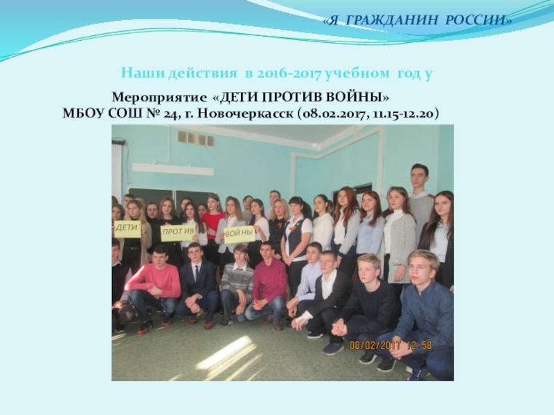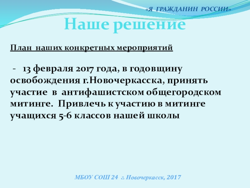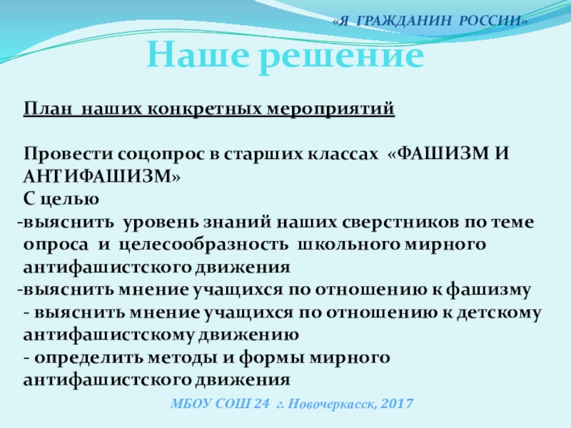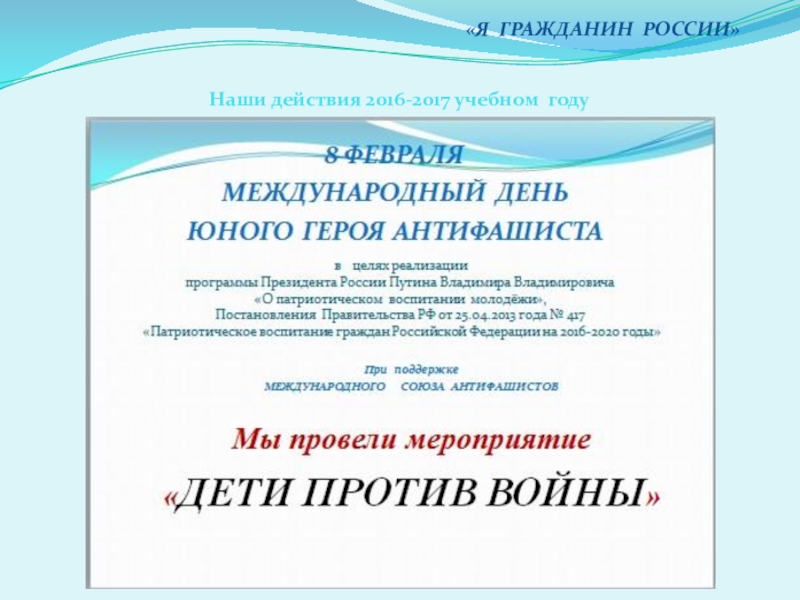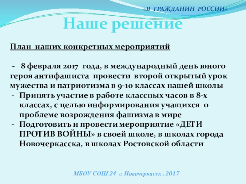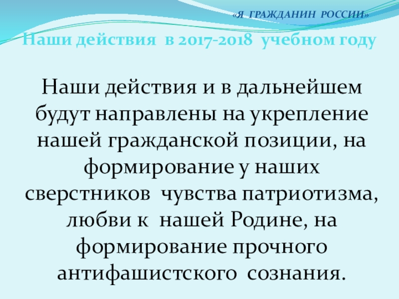 Наши действия и в дальнейшем будут направлены на укрепление нашей гражданской позиции , на формирование у наших сверстников чувства патриотизма, любви к нашей Родине, на формирование прочного антифашистского сознания.