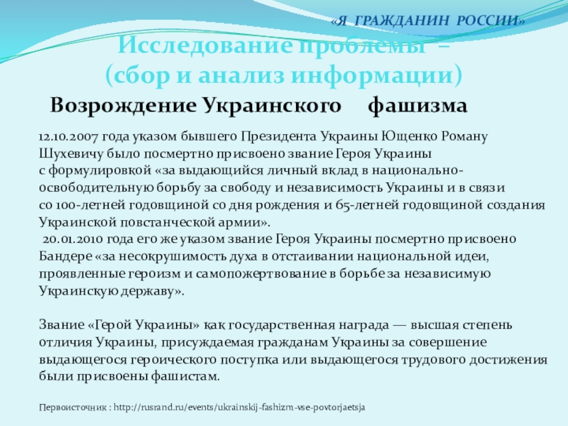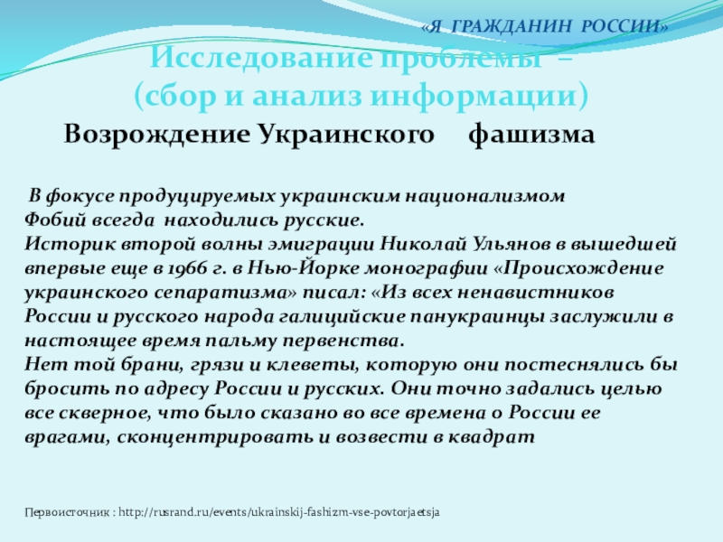 Сегодня , в Украине, которая всегда была братским для России государством – молодежи прививается чувство ненависти к России, из государства Россия искусственно формируется образ врага, образ агрессора.