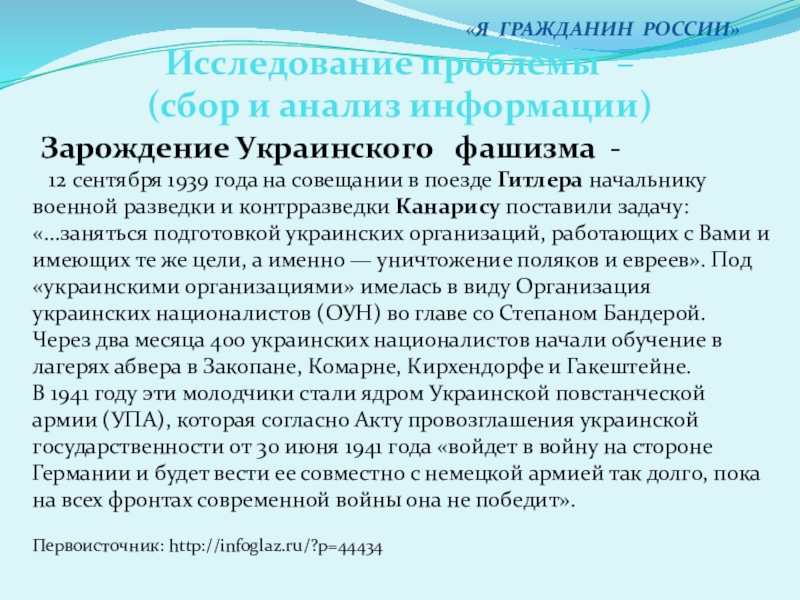 В 1941 году эти молодчики стали ядром Украинской повстанческой армии (УПА), которая согласно Акту провозглашения украинской государственности от 30 июня 1941 года «войдет в войну на стороне Германии и будет вести ее совместно с немецкой армией так долго, пока на всех фронтах современной войны она не победит».