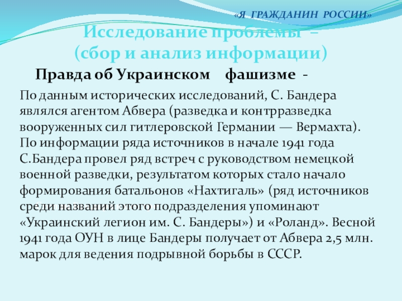 По данным исторических исследований, С. Бандера являлся агентом Абвера (разведка и контрразведка вооруженных сил гитлеровской Германии — Вермахта).
