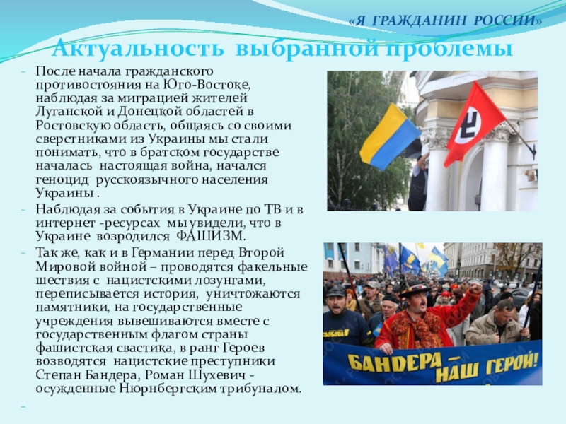 жителей Луганской и Донецкой областей в Ростовскую область, общаясь со своими сверстниками из Украины мы стали понимать, что в братском государстве началась настоящая война, начался геноцид русскоязычного населения Украины .