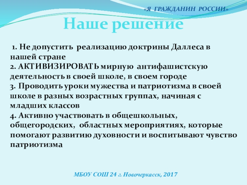 Поэтому, мы убеждены, что духовность и патриотизм сегодня это самые актуальные проблемы молодежи которые необходимо решать в самое ближайшее время. Наша команда готова принять участие в решении этих проблем хотя бы на уровне нашей школы, нашего города