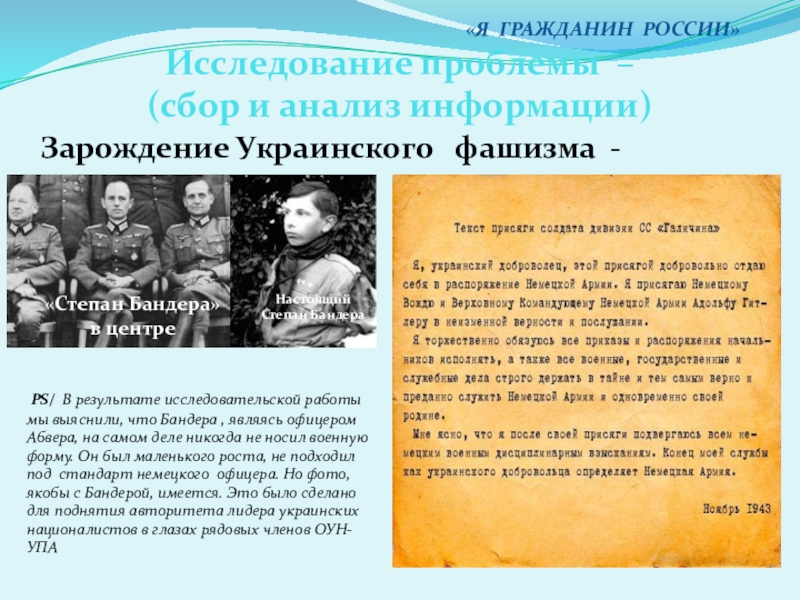 PS/ В результате исследовательской работы мы выяснили, что Бандера , являясь офицером Абвера, на самом деле никогда не носил военную форму. Он был маленького роста, не подходил под стандарт немецкого офицера. Но фото, якобы с Бандерой, имеется. Это было сделано для поднятия авторитета лидера украинских националистов в глазах рядовых членов ОУН-УПА