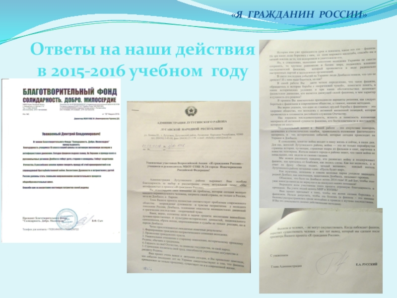 В 2016 году мы получили ответ из Лутугинской районной Администрации ЛНР и Благодарность от Благотворительного Фонда «Солидарность. Добро. Милосердие». В этих документах нас благодарят за активную жизненную антифашистскую позицию.
