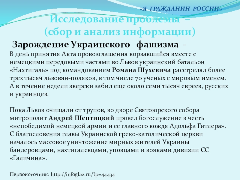 Пока Львов очищали от трупов, во дворе Святоюрского собора митрополит Андрей Шептицкий провел богослужение в честь «непобедимой немецкой армии и ее главного вождя Адольфа Гитлера». С благословения главы Украинской греко-католической церкви началось массовое уничтожение мирных жителей Украины бандеровцами, нахтигалевцами, уповцами и вояками дивизии СС «Галичина».