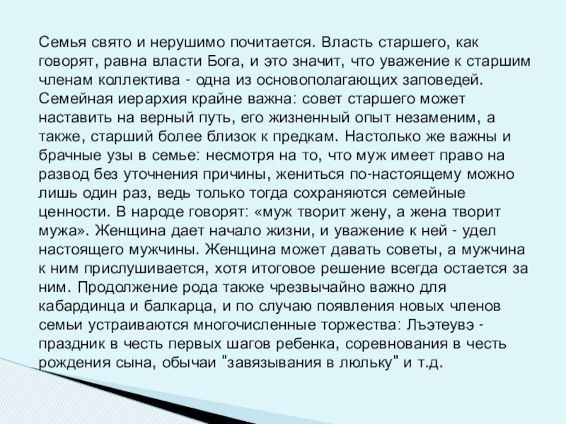 Слайд 15Семья свято и нерушимо почитается. Власть старшего, как говорят, равна власти