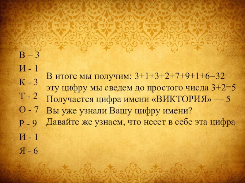 Получается цифра имени «ВИКТОРИЯ» — 5