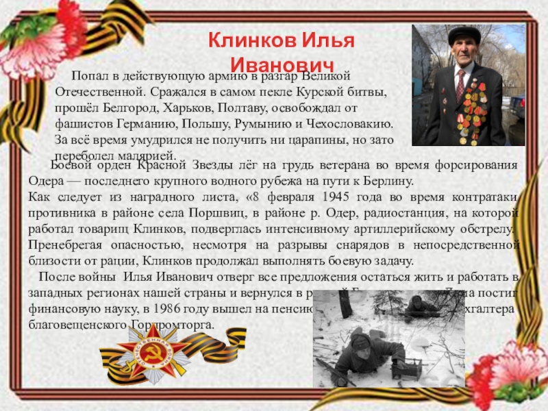 Как следует из наградного листа, «8 февраля 1945 года во время контратаки противника в районе села Поршвиц, в районе р. Одер, радиостанция, на которой работал товарищ Клинков, подверглась интенсивному артиллерийскому обстрелу. Пренебрегая опасностью, несмотря на разрывы снарядов в непосредственной близости от рации, Клинков продолжал выполнять боевую задачу.