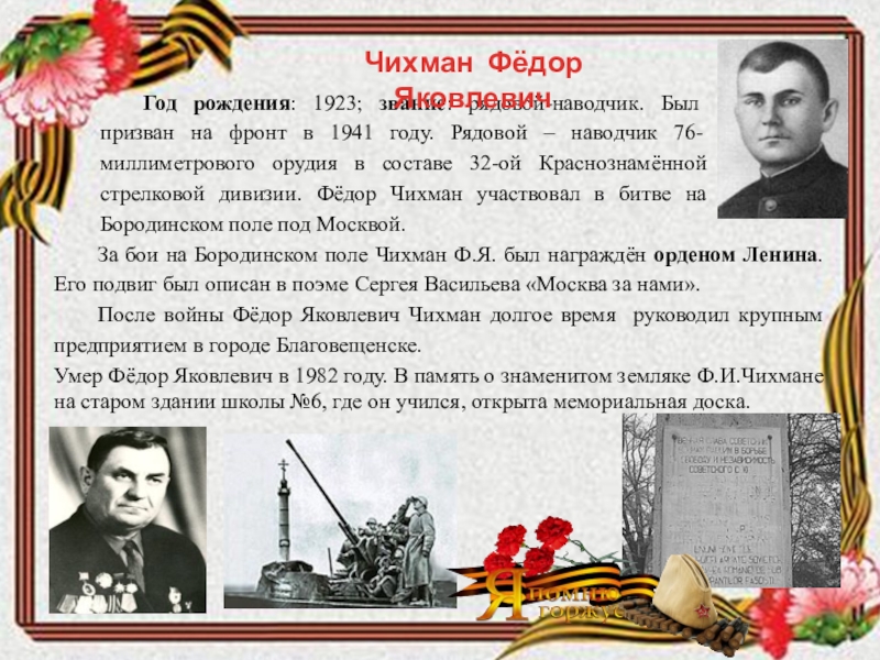 За бои на Бородинском поле Чихман Ф.Я. был награждён орденом Ленина. Его подвиг был описан в поэме Сергея Васильева «Москва за нами».