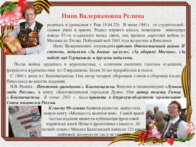 К своему 90-летию бывшая радистка выпустила новую книгу «Молодость военная моя». Самой яркой частью издания является публикация фронтовой переписки юной Нины и фронтовика-танкиста. 24-летний танкист Михаил Балаганский написал 125 писем любимой, которую он так и не увидел..