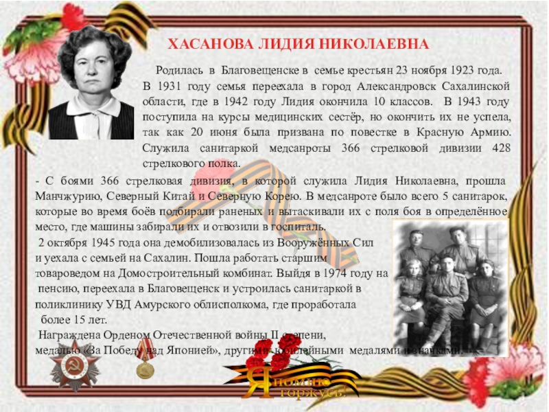 родилась в уральском г. Реж 18.04.22г. В июле 1941г. со студенческой скамьи ушла в армию. Радист первого класса, помощник командира взвода 87-го отдельного полка связи, она прошла дорогами войны от Москвы до Литвы. Победный май 1945 года встретила в Вильнюсе.