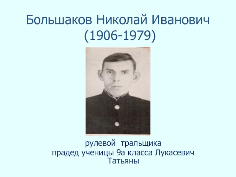 Большаков Николай Иванович  (1906-1979)рулевой тральщикапрадед ученицы 9а класса Лукасевич Татьяны