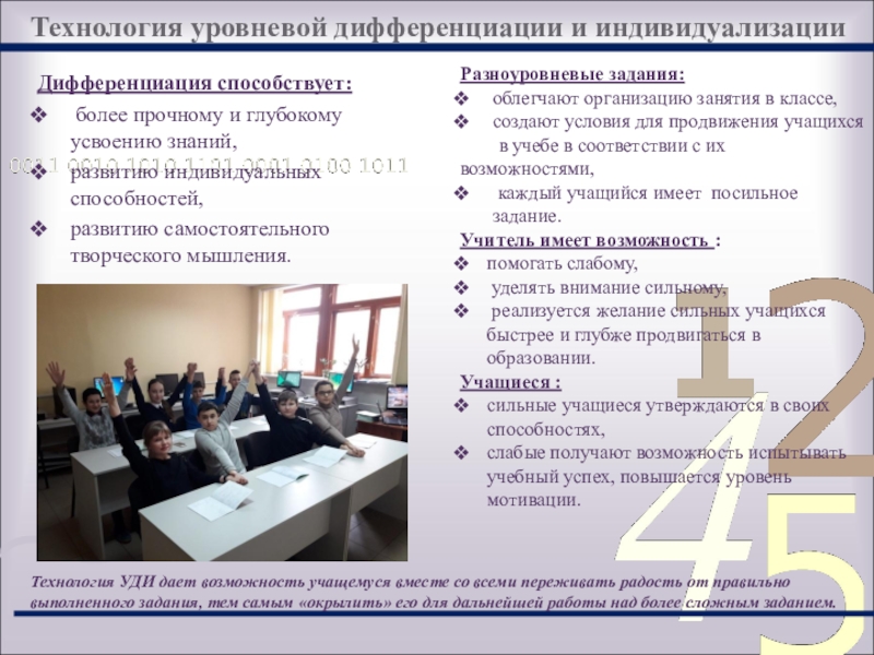 Технология УДИ дает возможность учащемуся вместе со всеми переживать радость от правильно выполненного задания, тем самым «окрылить» его для дальнейшей работы над более сложным заданием.