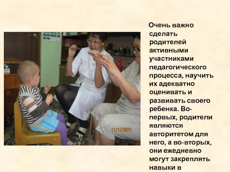 участниками педагогического процесса, научить их адекватно оценивать и развивать своего ребенка. Во-первых, родители являются авторитетом для него, а во-вторых, они ежедневно могут закреплять навыки в непосредственном общении.