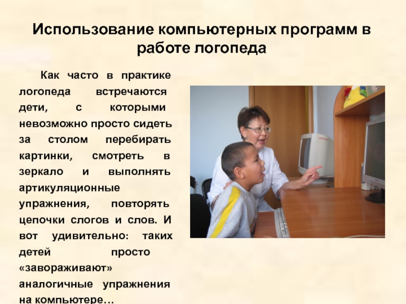 практике логопеда встречаются дети, с которыми невозможно просто сидеть за столом перебирать картинки, смотреть в зеркало и выполнять артикуляционные упражнения, повторять цепочки слогов и слов. И вот удивительно: таких детей просто «завораживают» аналогичные упражнения на компьютере…