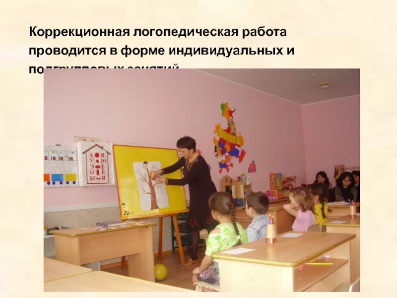 Слайд 6Коррекционная логопедическая работа проводится в форме индивидуальных и подгрупповых занятий.
