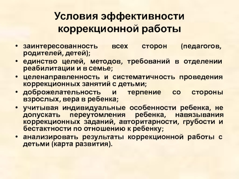 учитывая индивидуальные особенности ребенка, не допускать переутомления ребенка, навязывания коррекционных заданий, авторитарности, грубости и бестактности по отношению к ребенку;