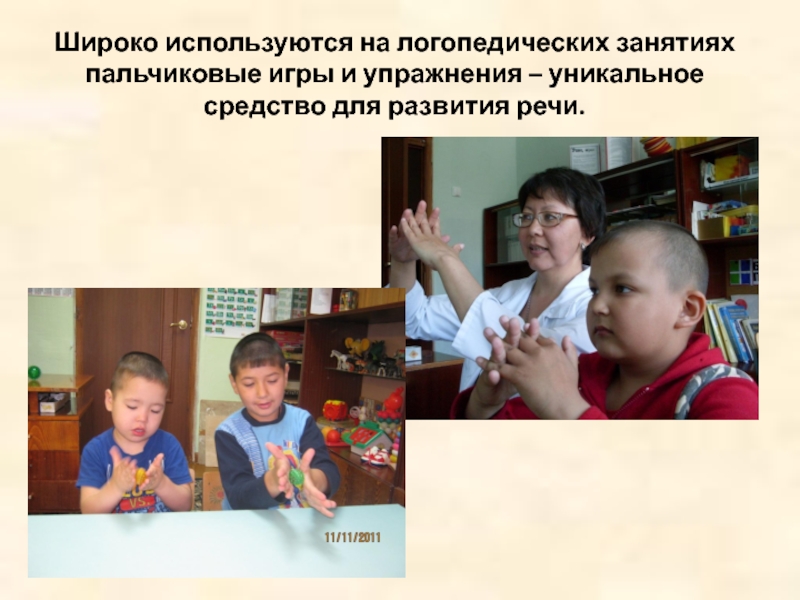 Слайд 10Широко используются на логопедических занятиях пальчиковые игры и упражнения – уникальное
