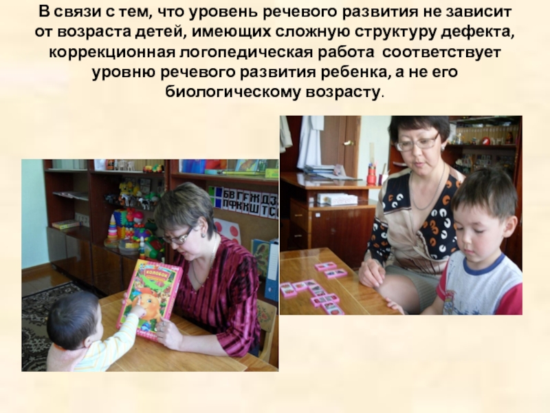 возраста детей, имеющих сложную структуру дефекта, коррекционная логопедическая работа соответствует уровню речевого развития ребенка, а не его биологическому возрасту.