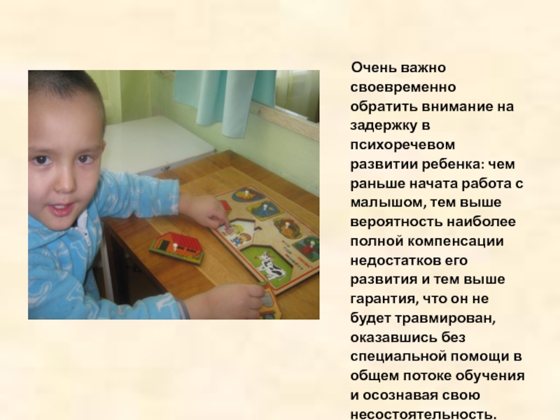 психоречевом развитии ребенка: чем раньше начата работа с малышом, тем выше вероятность наиболее полной компенсации недостатков его развития и тем выше гарантия, что он не будет травмирован, оказавшись без специальной помощи в общем потоке обучения и осознавая свою несостоятельность.
