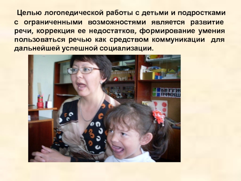 Слайд 2 Целью логопедической работы с детьми и подростками с ограниченными возможностями