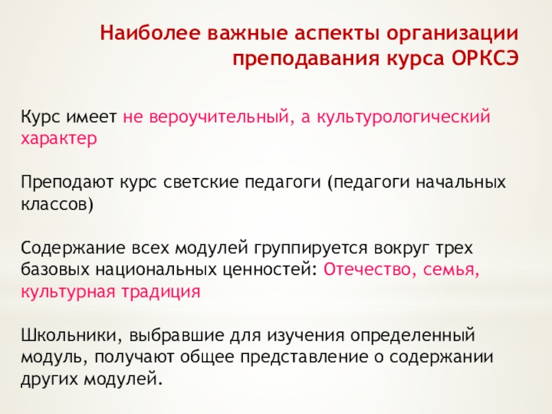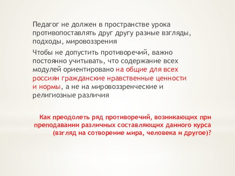 Чтобы не допустить противоречий, важно постоянно учитывать, что содержание всех модулей ориентировано на общие для всех россиян гражданские нравственные ценности и нормы, а не на мировоззренческие и религиозные различия