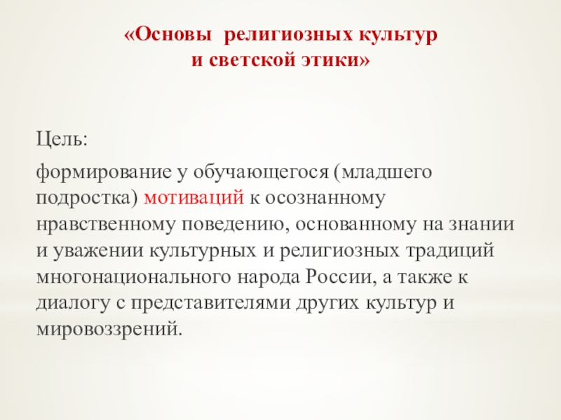 к осознанному нравственному поведению, основанному на знании и уважении культурных и религиозных традиций многонационального народа России, а также к диалогу с представителями других культур и мировоззрений.