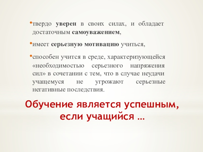 Слайд 47Обучение является успешным, если учащийся …