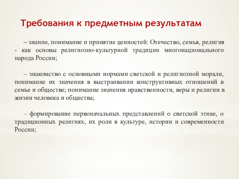 – знакомство с основными нормами светской и религиозной морали, понимание их значения в выстраивании конструктивных отношений в семье и обществе; понимание значения нравственности, веры и религии в жизни человека и общества;