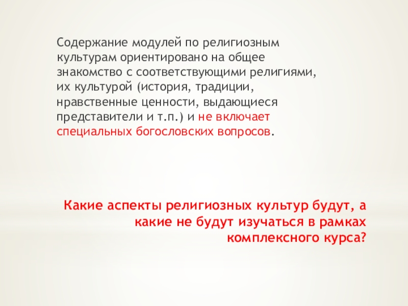 Содержание модулей по религиозным культурам ориентировано на общее знакомство с соответствующими религиями, их культурой (история, традиции, нравственные ценности, выдающиеся представители и т.п.) и не включает специальных богословских вопросов.