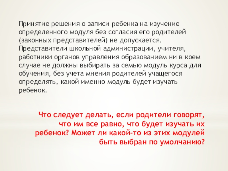 Принятие решения о записи ребенка на изучение определенного модуля без согласия его родителей (законных представителей) не допускается. Представители школьной администрации, учителя, работники органов управления образованием ни в коем случае не должны выбирать за семью модуль курса для обучения, без учета мнения родителей учащегося определять, какой именно модуль будет изучать ребенок.