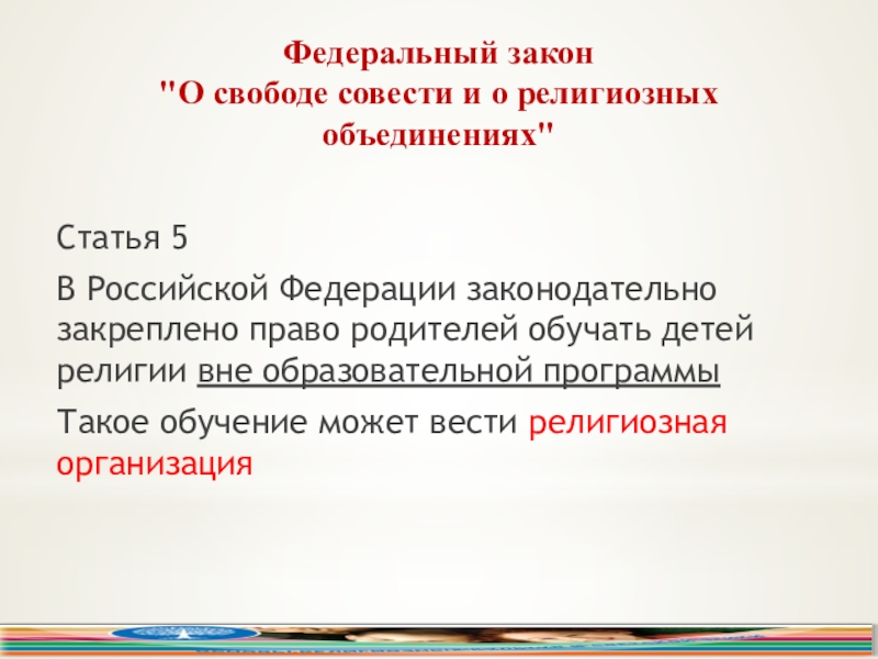 Федерации законодательно закреплено право родителей обучать детей религии вне образовательной программы