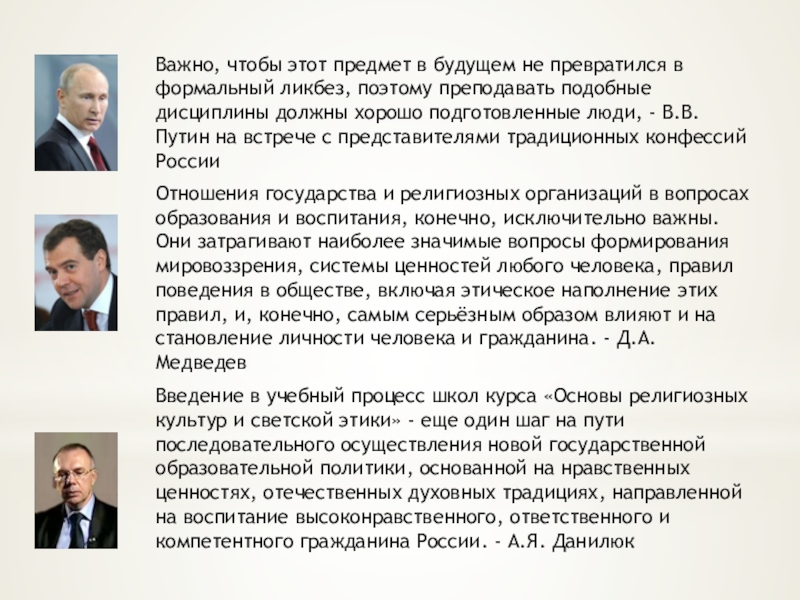 Введение в учебный процесс школ курса «Основы религиозных культур и светской этики» - еще один шаг на пути последовательного осуществления новой государственной образовательной политики, основанной на нравственных ценностях, отечественных духовных традициях, направленной на воспитание высоконравственного, ответственного и компетентного гражданина России. - А.Я. Данилюк