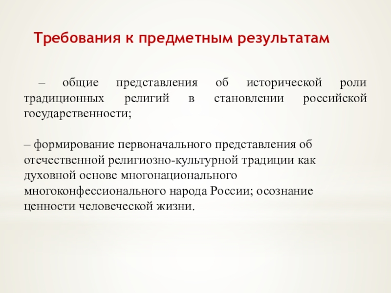 – формирование первоначального представления об отечественной религиозно-культурной традиции как духовной основе многонационального многоконфессионального народа России; осознание ценности человеческой жизни.