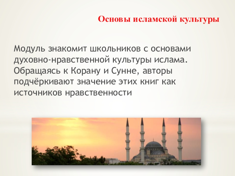 Модуль знакомит школьников с основами духовно-нравственной культуры ислама. Обращаясь