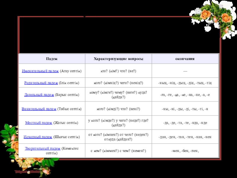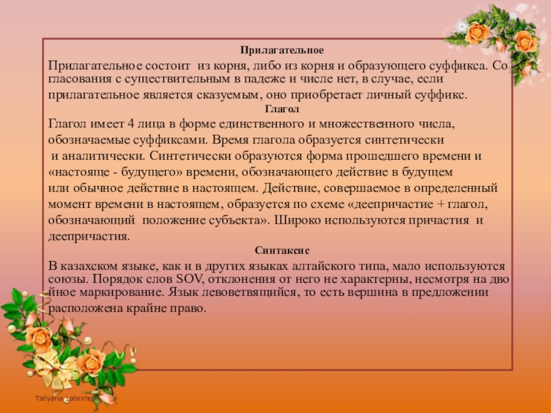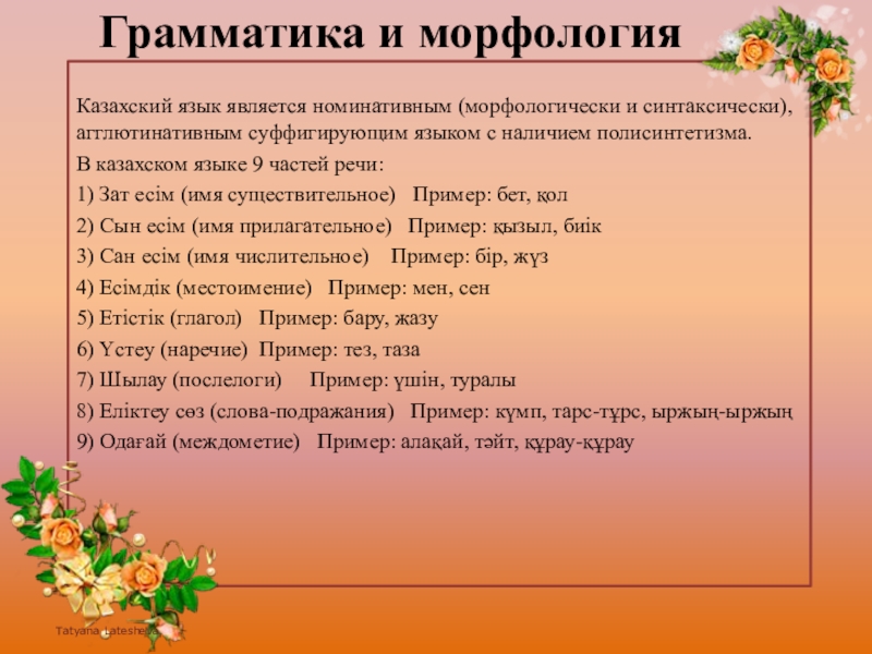 Казахский язык является номинативным (морфологически и синтаксически),агглютинативным суффигирующим языком с наличием полисинтетизма.