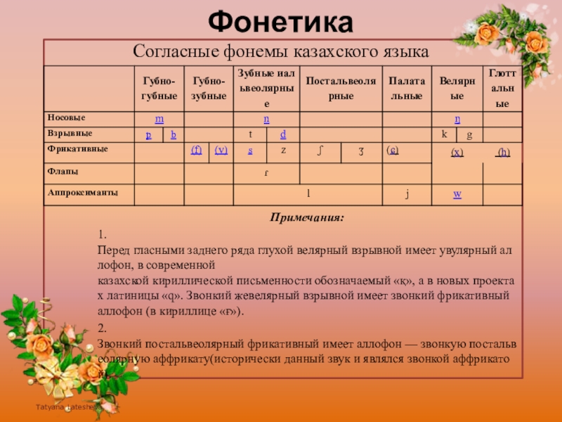 1.Перед гласными заднего ряда глухой велярный взрывной имеет увулярный аллофон, в современной казахской кириллической письменности обозначаемый «қ», а в новых проектах латиницы «q». Звонкий жевелярный взрывной имеет звонкий фрикативный аллофон (в кириллице «ғ»).
